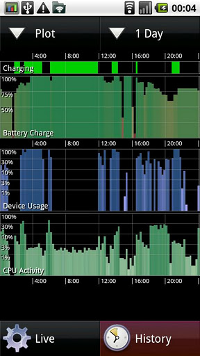 System Monitor: The system monitor can be enabled to record device usage history over a period of time (up to one week), such that you can determine what applications and usage patterns have the greatest impact on battery life. This feature is commonly used to help track down which applications are having major negative effects on battery life. The system monitor records CPU usage for each process, overall CPU usage, display usage, battery level, and battery charging status.